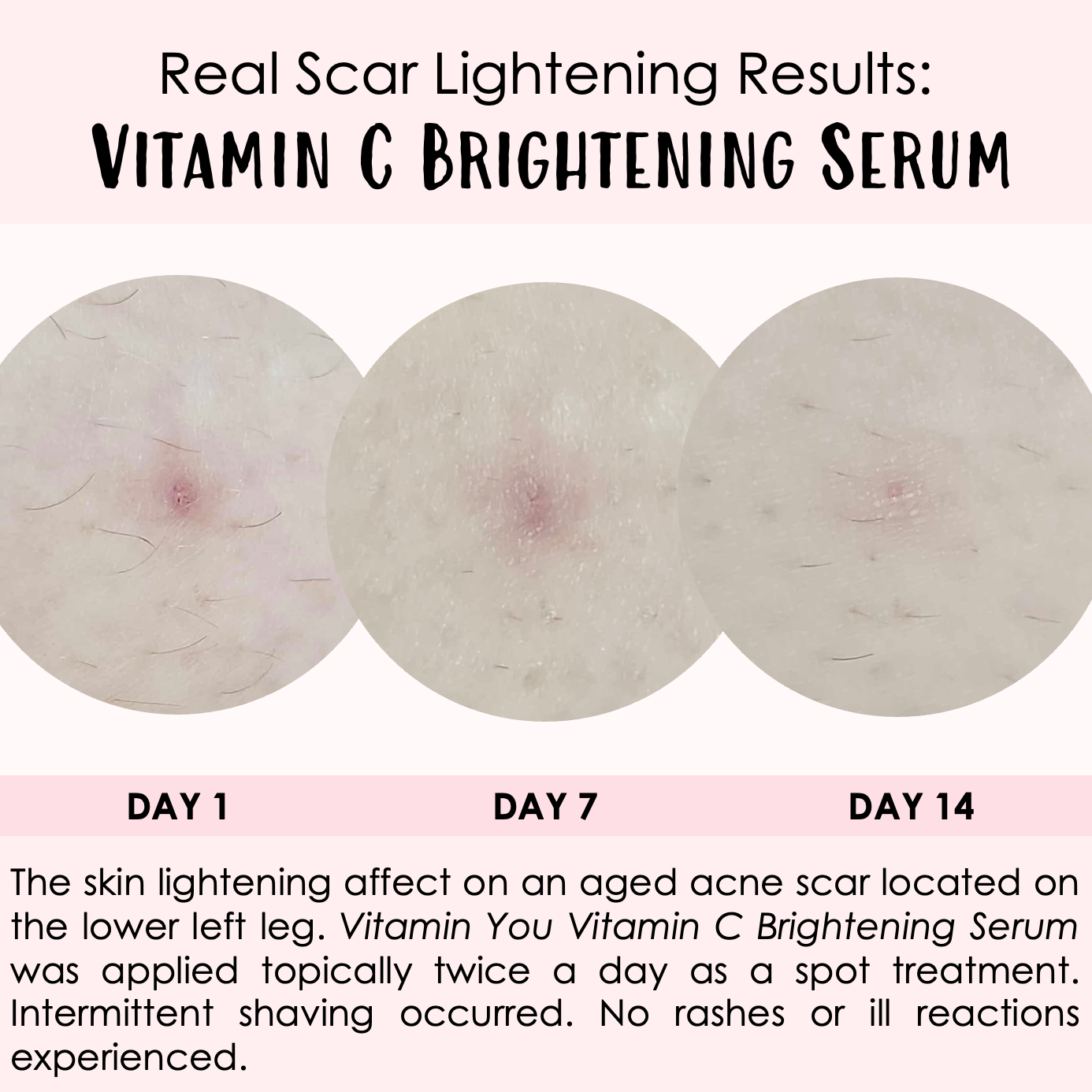 This Vitamin C Serum improves skin tone and complexion. It was able to visibly reduce redness and discoloration from an acne scar in just 14 days!